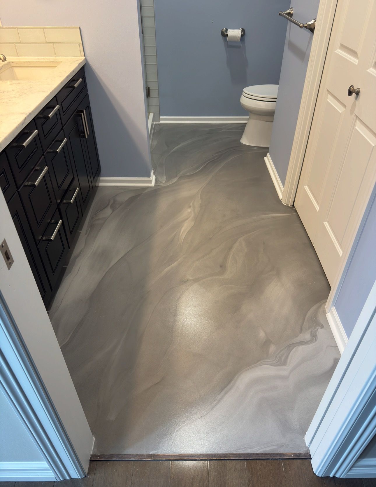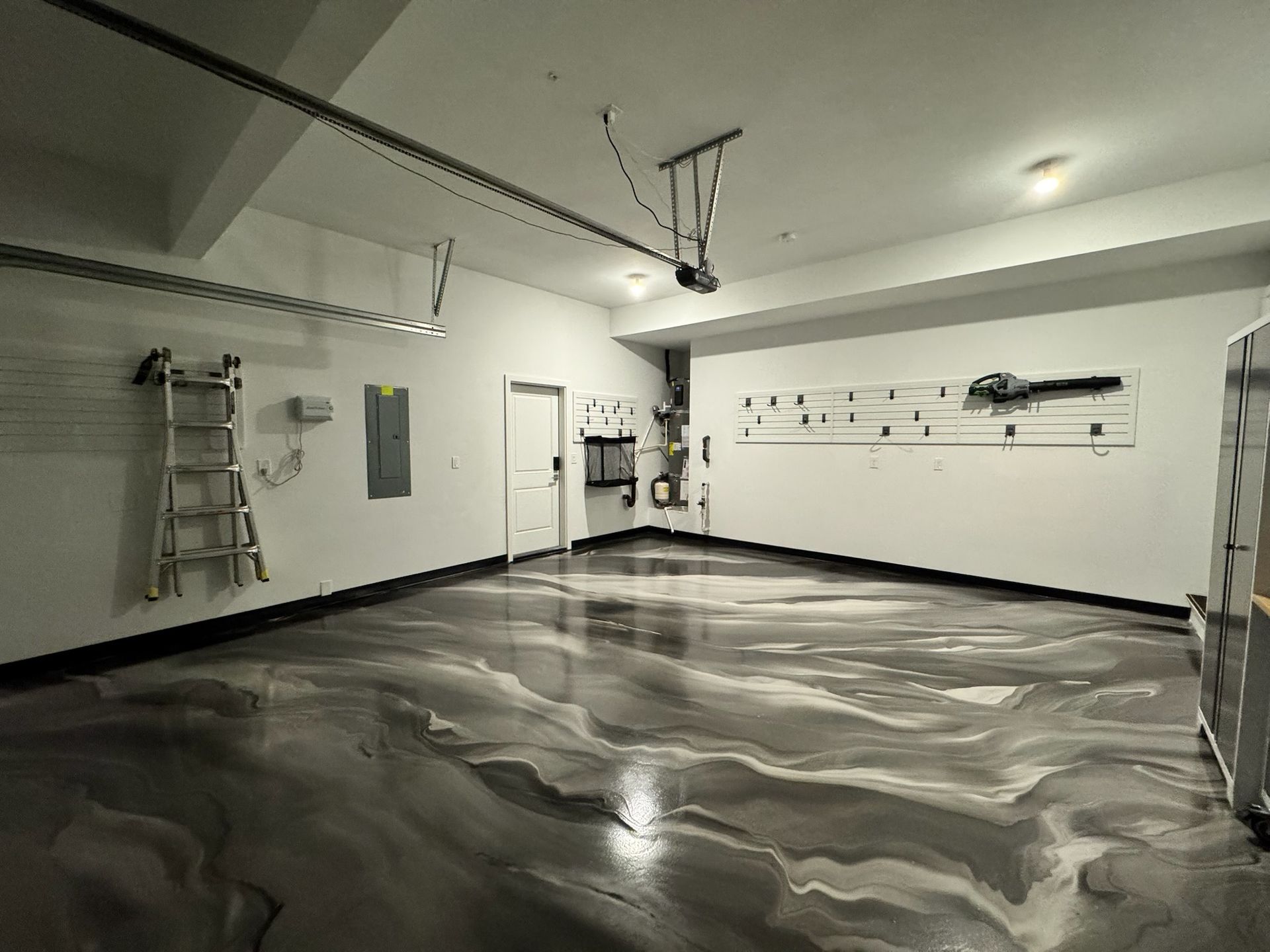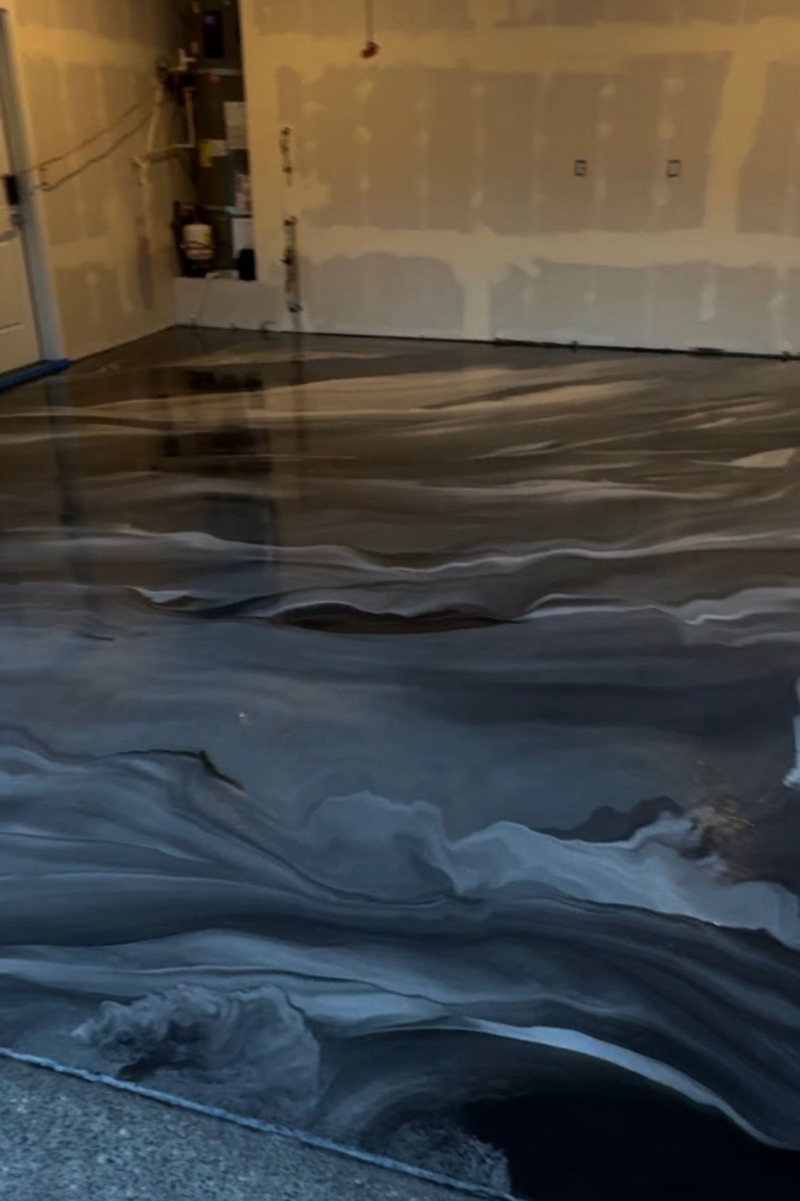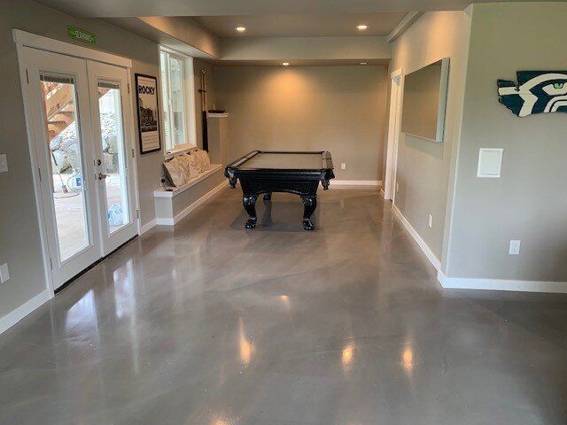 A close up of a gray and black epoxy floor in a basement.
