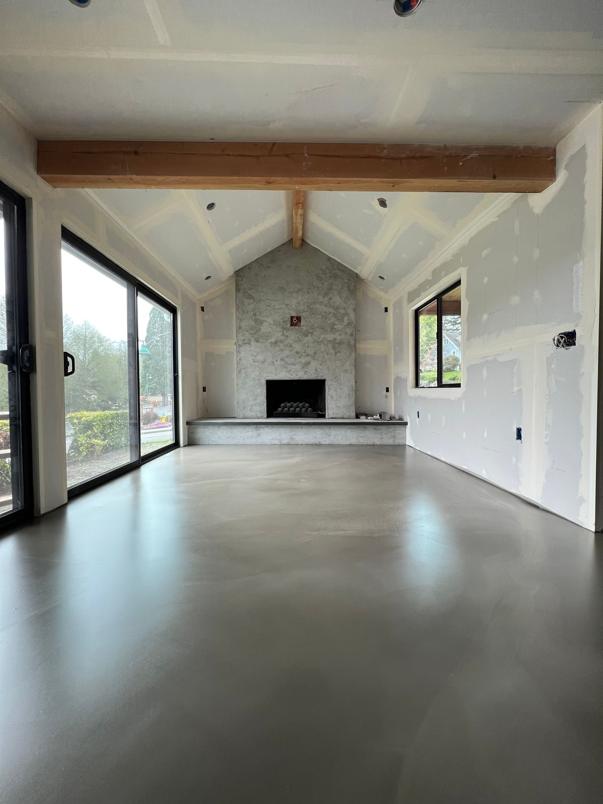 A living room with a shiny concrete floor and a white wall.